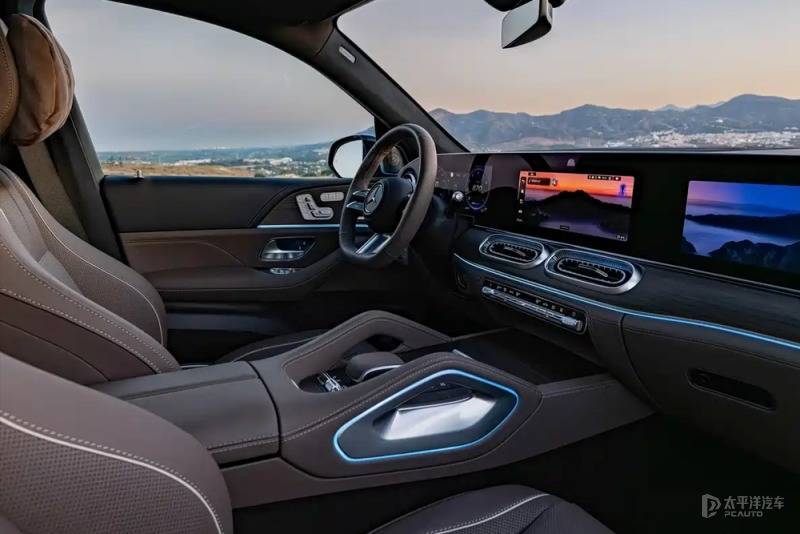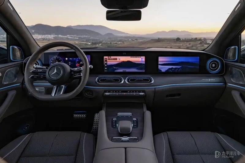 内饰搭载一体化玻璃面板集成的3块12.3英寸显示屏(MBUX Superscreen系统),横贯主副驾实现独立娱乐,中控台与空调出风口重新设计,保留实体按键兼顾触控与盲操安全。