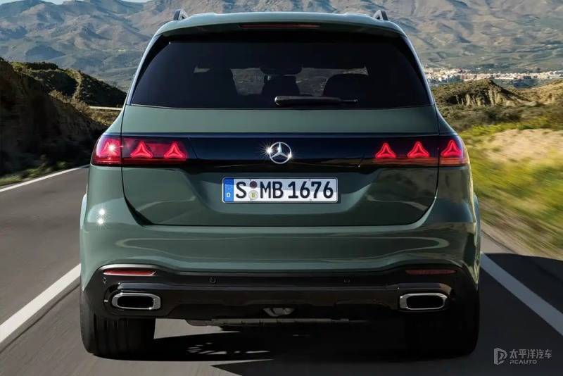 新车新增暮夜黑、水晶银、祖母绿金属漆等车身颜色,隐藏式门把手优化风阻至 0.32Cd。侧面线条沉稳舒展,能把全尺寸SUV的气势散发出来。同时,车辆还提供21-23英寸多辐轮圈可选。车辆尾部,新车升级了与新款E级同源的贯穿式立体星形图案尾灯,搭配贯穿式镀铬饰条与双边四出排气,运动感与科技感兼具。