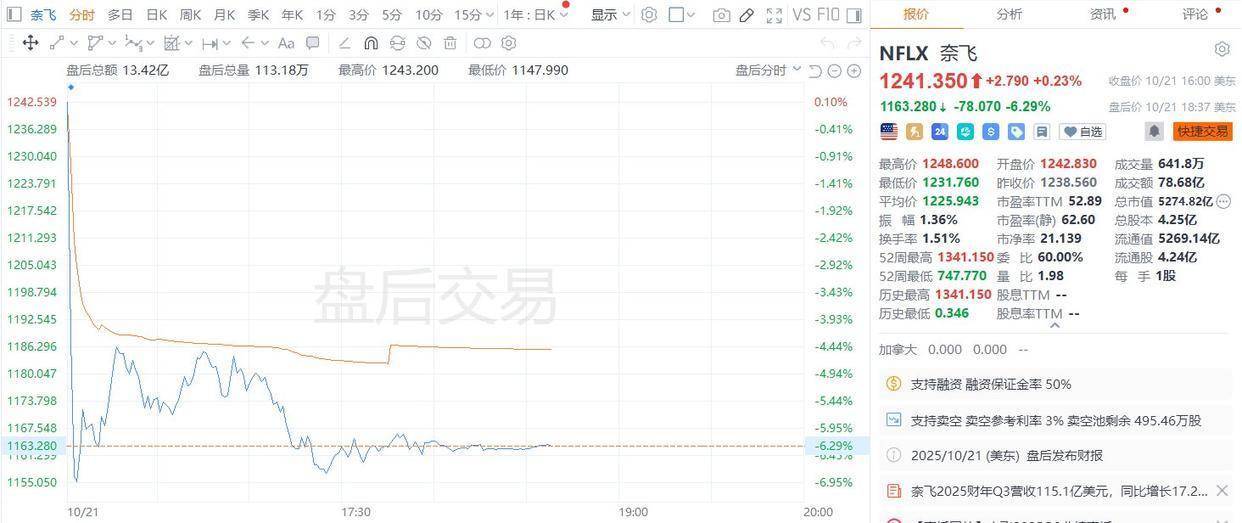 奈飞(NFLX.US)盘后跌逾6%,报1163.28美元。奈飞第三季度营收达115.1亿美元,同比增长17.2%;预计第四季度营收为119.6亿美元;第三季度净利润为25.47亿美元,去年同期为23.64亿美元;第三季度每股收益5.87美元。公司预计全年营收451亿美元,公司原本预计448亿-452亿美元。